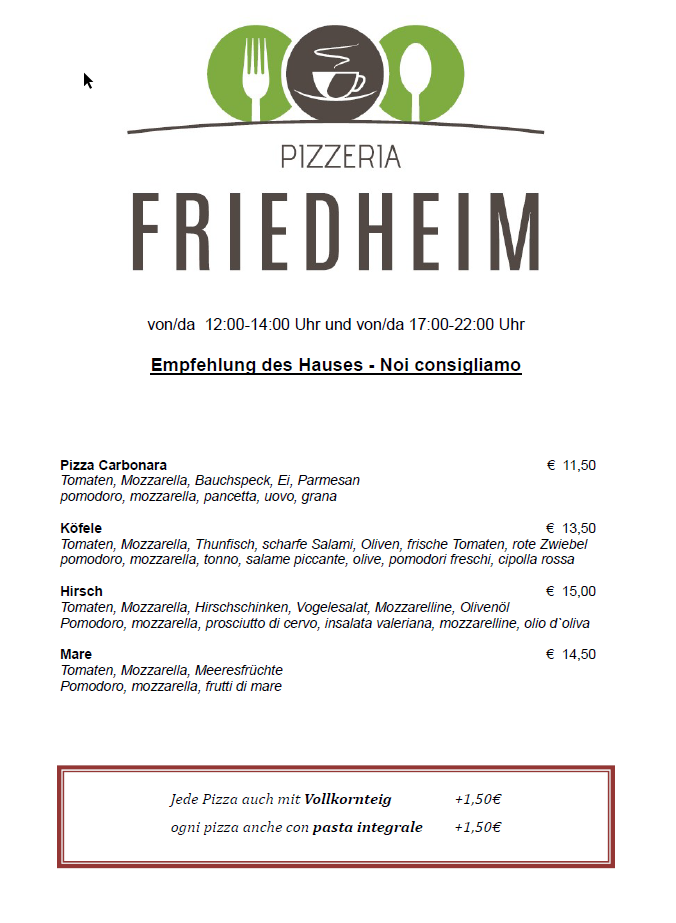 Bar Pizzeria Friedheim Menu
